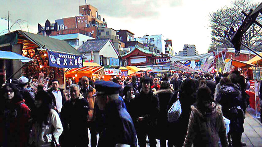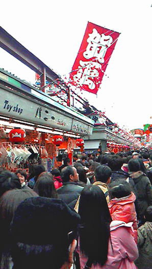浅草寺初詣 ○浅草寺初詣 午前中は学校の新年賀詞交換会。午後からちょっと浅草へ出る。 電車の向こう側のシートに座っていた母娘連れの娘(20代前半か)のかぶっていた野球帽のロゴが、"Suicidal Tendency"というので、驚愕する。「自殺願望」とでも意訳できるだろう。親はわかっていないのか。そもそもそんな帽子、だれが作って売っているのだ。またよくそんなものを買うものだ。 浅草はそんな不健康ではない、人だかりの初詣風景。浅草寺と浅草神社に参拝。 仲見世です。立ち止まったり、しゃべったり、食べ物を買ったり。 浅草寺側から見た仲見世。人、人、人。まだ羽子板屋が出ています。 小屋掛の中での一杯。これが楽しいのですよね。参詣も、これが目的かも。 国際通りの浅草公会堂。新春歌舞伎の最中で、チケットを持った人が入っていきました。 帰りはいつもどおり、「アンヂェラス」の洋菓子を土産に求め、表参道での乗換えを利用して、「紀ノ国屋」でイギリスパンを買って帰宅。 [0回]