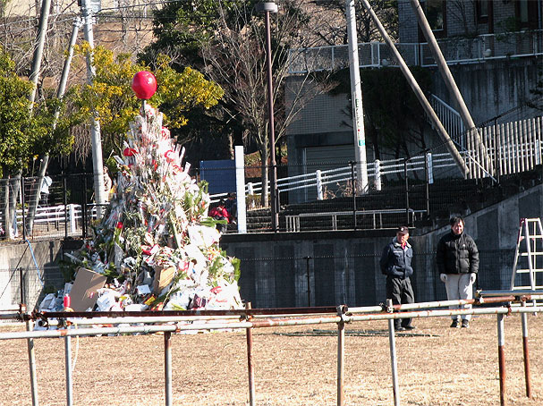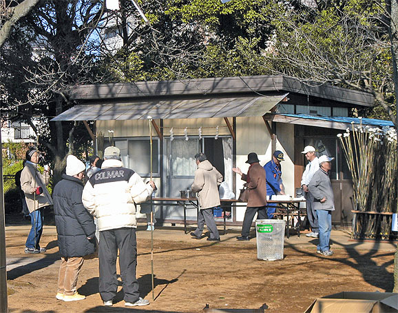 どんど焼 ○どんど焼 今日は地元の氏神で「どんど焼」があった。積み重ねたお札や正月飾りを燃やし、竹の棒に刺した餅を焼く。 昼から出かける。行く道で、三脚にカメラを構えた人、また高価そうなカメラを持った人をみかける。何を狙っているのかと思ったら、妻が「かわせみがいる」と言う。どこから来たのか、このニュータウンに人工的に整えられた小径沿いのせせらぎに、一羽飛んで行く。私は、かわせみを生まれて初めて見た。羽根が確かに「翠色」だ。オレンジ色の部分も見えた。感動的だが、腑に落ちないのは、二人の素人カメラマン氏の存在だ。どうして、どうやって、かわせみの飛来と出現を知ったのだろう。もしかしてどこかに「かわせみウォッチャー」がいて、リアルタイムで情報を発信しているのか。 神社に着いたら、「午後2時から」ということで、まだ30分以上あり、待っていると寒いし、参拝して雰囲気だけ楽しんで戻る。氏子はもっぱら旧住民の人たちだと思うが、楽しみに餅を焼きにやってくる子どもたちには新住民も多いだろう。この神社も、地域のよりどころとして、もっと来る人が増えていってほしいものだ。大それた言い方だが、私が足を運びだすと、さびれたところもたちまち隆盛になる。行列ができ、整理のポリスが出るようになり、駐車場が整備される。 現にここも、去年の暮に、新社務所が作られた。ありがたいことだと思うばかりだ。 どんど焼のために組み上げた正月飾り類です。神棚などもありました。てっべんはだるまです。 旧社務所の前で、甘酒を振舞っていました。右側に立てかけてあるもの、また前の人が持っているものは、竹棒に刺した餅です。だいたい、ここのどんど焼は、小正月の火祭り、歳神送り、「左義長」として典型的なもののようです。 ちょうど友人ブログ「風写の黙示録」にもこのことが取り上げられていたので、併せてお読みください。面白いですよ。 [0回]
