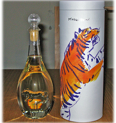 これが「満寿泉」です。毎年、干支のボトルに入って来ます。瓶の中の虎が見えるでしょうか。